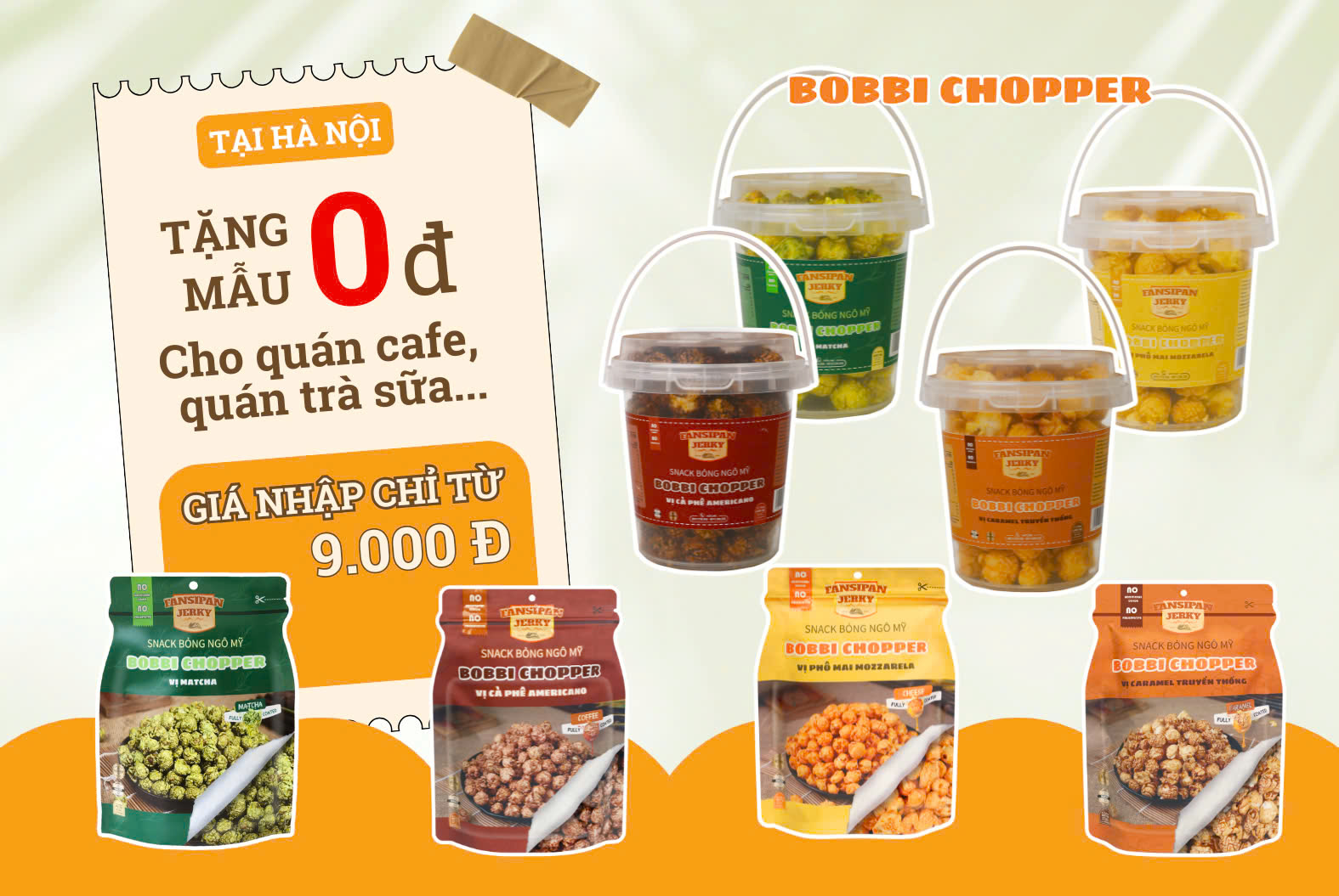Bạn đang kinh doanh quán cà phê, trà sữa hay cửa hàng đồ uống tại Hà Nội và muốn tìm kiếm một món ăn vặt hấp dẫn để thu hút khách hàng? Bỏng ngô Bobbi Chopper chính là sự lựa chọn hoàn hảo giúp nâng cao trải nghiệm khách hàng và tăng doanh thu cho quán. Đặc biệt, Thực Phẩm Fansipan đang triển khai chương trình “Tặng mẫu 0 đồng” dành riêng cho các quán cà phê, trà sữa và cửa hàng đồ uống tại Hà Nội. Đây là cơ hội tuyệt vời để bạn trải nghiệm sản phẩm chất lượng cao hoàn toàn miễn phí, đồng thời khám phá tiềm năng kinh doanh cùng Bobbi Chopper.