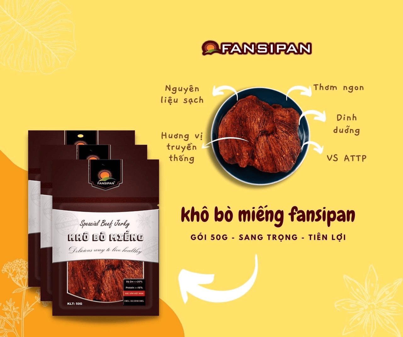 Tại Thực phẩm Fansipan, chúng tôi cam kết cung cấp sản phẩm Khô bò miếng chất lượng cao, không phải hàng trôi nổi trên thị trường. Đến với Thực phẩm Fansipan, quý khách hàng có thể hoàn toàn an tâm về chất lượng và giá cả.