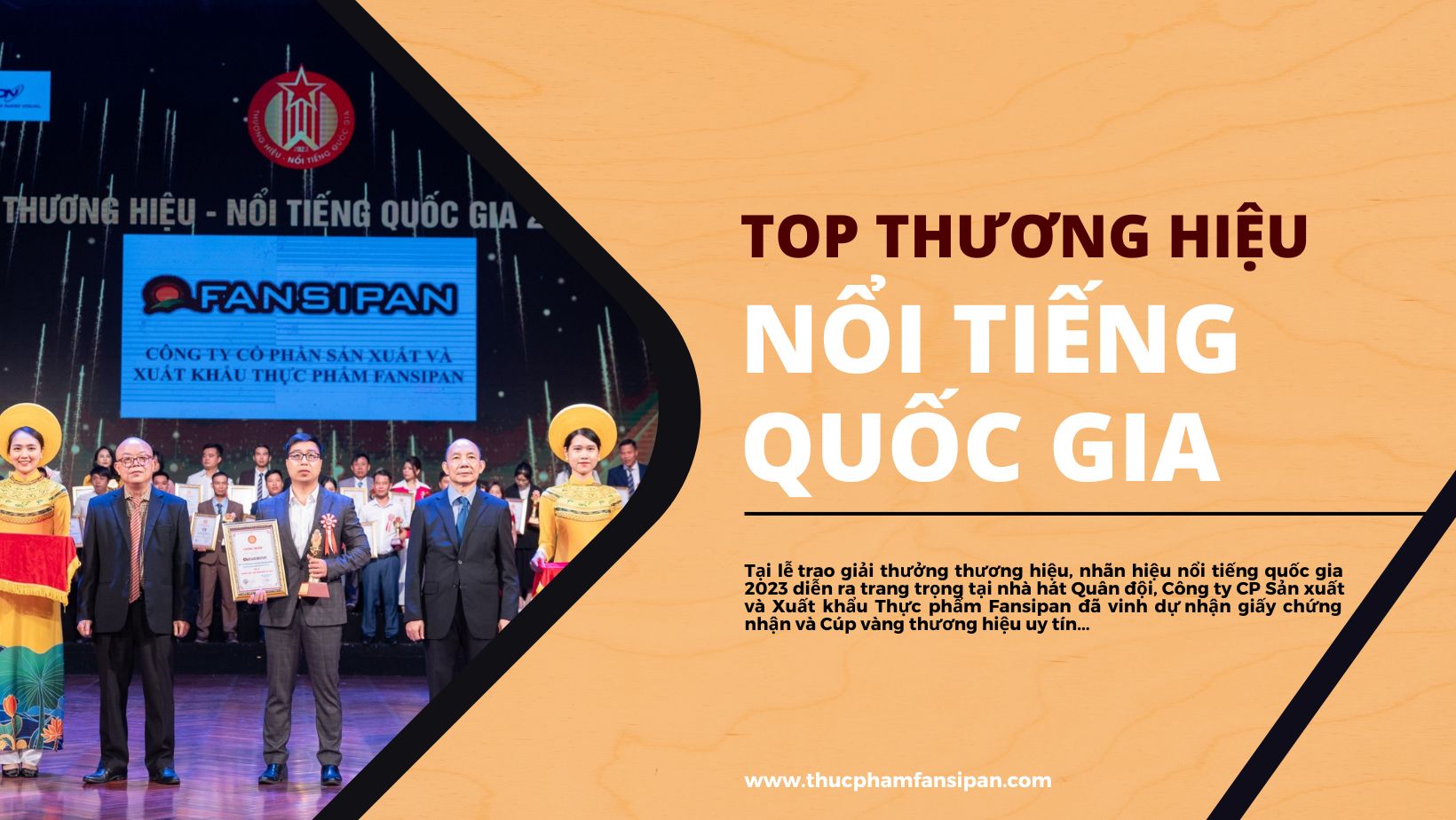 Tại lễ trao giải thưởng Thương hiệu, nhãn hiệu nổi tiếng quốc gia 2023 diễn ra trang trọng tại nhà hát Quân đội, Công ty CP Sản xuất và Xuất khẩu Thực phẩm Fansipan đã vinh dự nhận giấy chứng nhận và Cúp vàng thương hiệu uy tín. Giải thưởng càng có ý nghĩa hơn khi được trao tặng đúng dịp toàn đơn vị hướng đến kỷ niệm ngày thành lập 29/09 hàng năm.