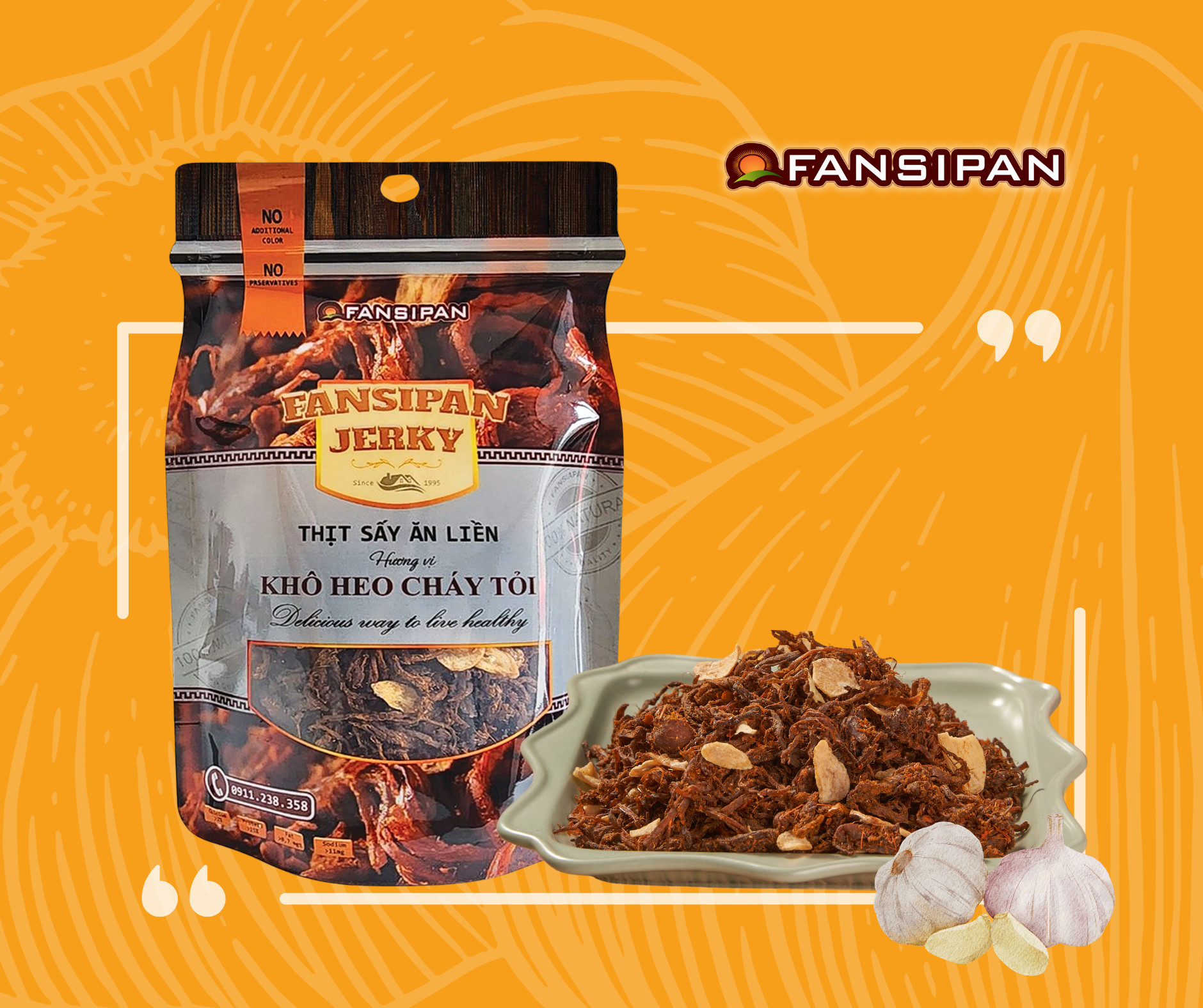 Khô heo cháy tỏi Fansipan là kết hợp hương vị thơm ngon của thịt heo với vị tỏi đặc trưng tạo nên một món ăn vặt vô cùng độc đáo và hấp dẫn, thích hợp để thưởng thức trong những dịp chill cùng bạn bè hoặc thậm chí là khi bạn chỉ đơn giản muốn thưởng thức một món ăn ngon vào những khoảng thời gian bạn muốn "relax"