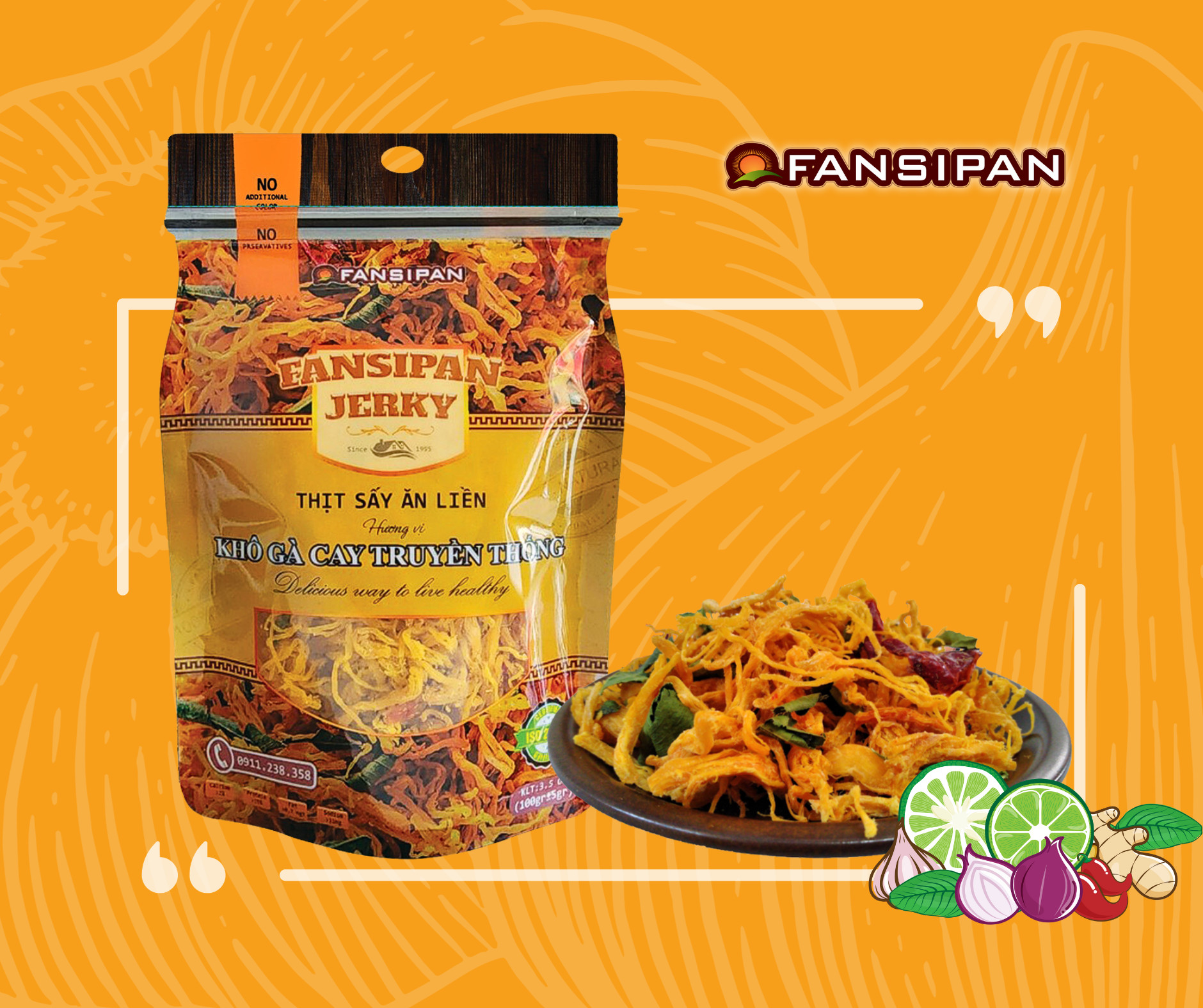 Khô gà cay của Fansipan sẽ khiến bạn tan chảy với sợi gà dai dai, hương vị cay nồng của ớt tươi và hương thơm thoang thoảng của lá chanh. Với túi zipper 100gr giúp bạn thuận tiện bảo quản, dễ dàng mang đi bất cứ đâu hay thậm chí là một món quà dành tặng cho bạn bè, những người thân yêu của bạn. Đây là một món ăn lý tưởng cho những người yêu thích hương vị đậm đà và cay cay.